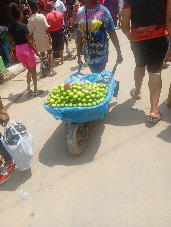 The image depicts an active street market scene in Fegge, Nigeria, under clear daylight conditions. A person, centrally positioned and facing generally towards the viewer, pushes a single-wheeled metal wheelbarrow. This individual wears a blue and purple tie-dye t-shirt with a graphic design, dark shorts, and a black shoulder bag. The wheelbarrow is lined with a blue plastic sheet and contains a large, tightly packed quantity of small, round, green produce, possibly garden eggs, with a small, light-colored container visible amidst the produce. To the immediate left foreground, the lower body of an individual is visible, wearing red sparkly shoes and dark pants, holding a white plastic shopping bag containing dark items. Multiple other individuals are present throughout the mid-ground and background. These include a person in a black t-shirt and pink shorts holding a dark object (possibly an umbrella or bag), another in a light beige t-shirt and dark shorts, and a partial view of a person in a black top with a red waistband and black shorts walking to the right of the wheelbarrow. The background shows blurred details consistent with market stalls, possibly displaying fabrics or other goods. The ground is a light-colored paved surface, exhibiting minor stains and scattered debris, including a small white wrapper. Strong shadows are cast across the ground, indicating direct overhead sunlight.