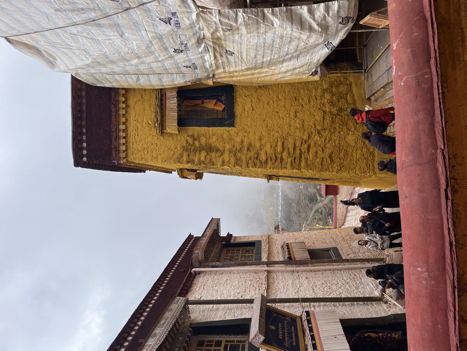 The image depicts an architectural complex within the Potala Palace in Lhasa, Tibet Autonomous Region, China, under an overcast sky. In the immediate foreground, a red-painted concrete barrier or wall extends horizontally. Two multi-story buildings frame a stone pathway. The building on the left features a white, textured facade, dark wooden window frames, and ornate, multi-tiered eaves beneath a dark red roofline. A rectangular sign bearing Tibetan script and "The Guardian Office" in English is mounted near its entrance. The building on the right exhibits a distinct yellow, textured facade, dark wooden window frames, and similar ornate eaves and red roofline. The lower-right portion of this yellow structure is obscured by a large, light-grey tarp, possibly indicating construction or maintenance. Approximately ten individuals are observed on the stone pathway between the two buildings. Their attire is varied, with some wearing dark, traditional robes and others dressed in contemporary casual clothing, including jackets and pants. They appear to be traversing the path; one individual in a red jacket and backpack is visible ascending on the right side, while another is seated or kneeling near the entrance of the white building on the left. Beyond the buildings, a steep, mist-shrouded valley or mountainous terrain is visible in the background, with faint horizontal elements possibly indicating distant roads or structures.