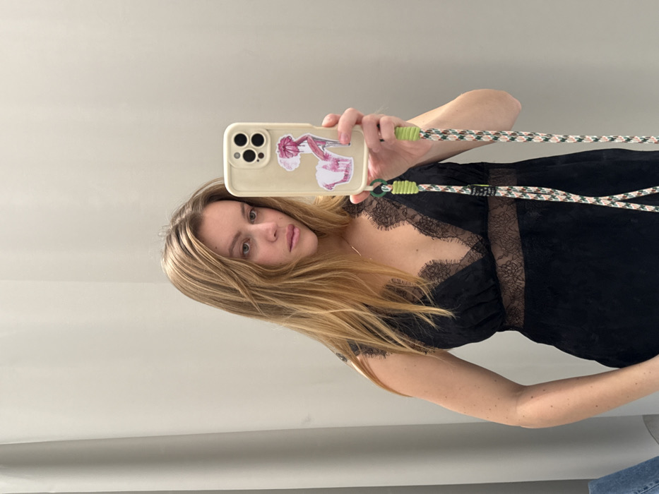 A young adult female, appearing Caucasian with long blonde hair, is captured in a mirror selfie. She wears a black sleeveless dress featuring a deep V-neckline with lace trim and a sheer lace band across the torso. In her right hand, she holds a cream-colored smartphone with a distinctive camera module and a decorative sticker depicting a pink high-heeled shoe with a bow. The phone is attached to a multi-colored braided lanyard with green plastic elements. Her expression is neutral as she looks towards the phone. The background consists of plain, light-colored walls, consistent with an indoor fitting room or changing area. A folded denim garment is partially visible on the far left. The specific location within the city of Rome, Italy, cannot be determined from the visual evidence present in the image.