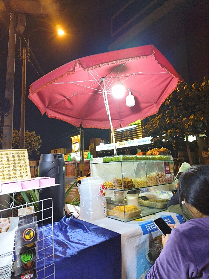 A street vendor operates under a red umbrella with a light bulb hanging in the center