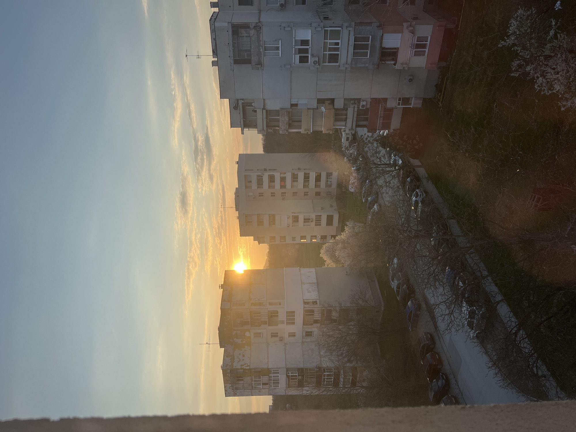 An elevated view captures a residential area in Plovdiv, Bulgaria, at either sunrise or sunset, indicated by the low sun casting warm, intense light and lens flare across the scene. The sky transitions from a brilliant yellow-orange at the horizon to a pale blue overhead, with scattered, thin white and orange clouds. In the left foreground, a rough, light-colored concrete wall of the vantage point structure is visible. Three multi-story concrete apartment blocks dominate the mid-ground. The leftmost block, approximately 8-10 stories, exhibits weathered grey and off-white facades with peeling paint and numerous windows and enclosed balconies. The sun is directly behind this building, creating a bright silhouette and halo effect. Further back and slightly right, another similar apartment block is partially visible. To the right, a third multi-story concrete block, featuring multiple windows, a mix of open and enclosed balconies, and numerous external air conditioning units, is prominently displayed. Antennas are visible on the roofs of the outer two apartment blocks. Below the buildings, a paved road winds diagonally through the scene. Numerous dark-colored sedans and hatchbacks are parked along the road and in adjacent parking areas. Deciduous trees, mostly bare or with sparse early spring foliage, line the road and green spaces between the buildings. A tree with white blossoms stands out in the lower right foreground. Patches of green grass are visible on the ground. No individuals or specific actions are discernible in the scene.