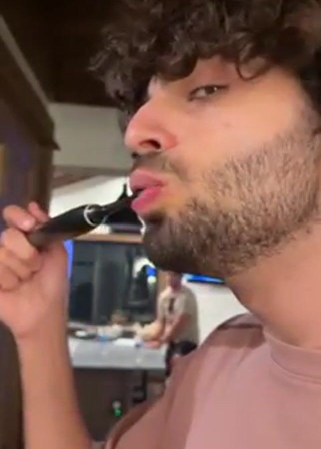 A close-up shot shows a man with curly brown hair and a short beard brushing his teeth with an electric toothbrush