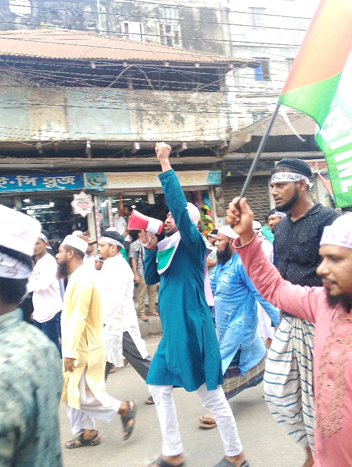 A group of men, mostly wearing white clothing and some with white skullcaps, are walking down a street in Bhola, Bangladesh