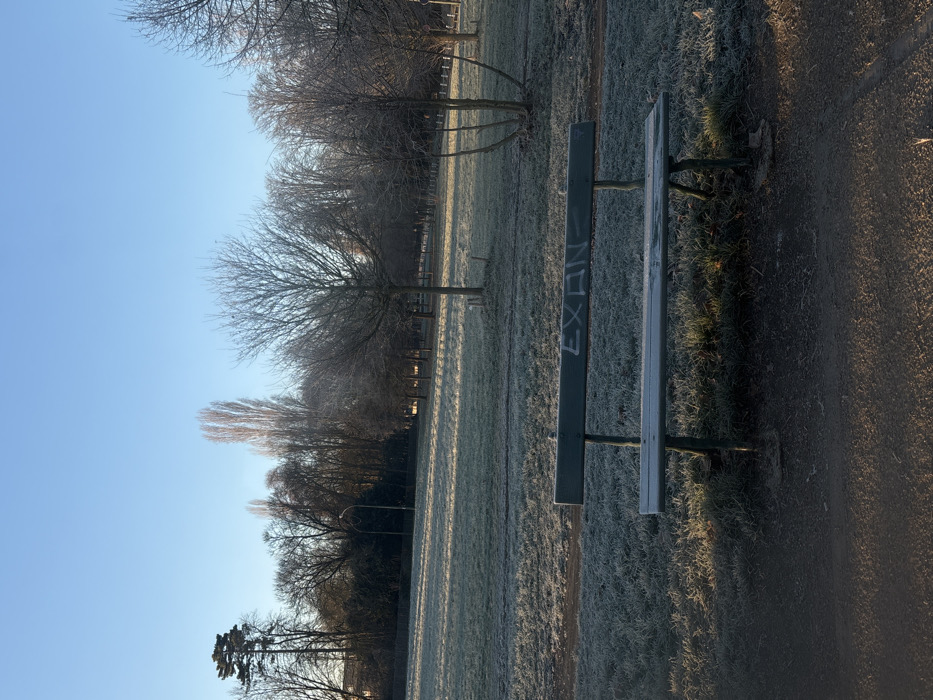 This image displays a frosty winter or late autumn morning scene within a public park in Paris, France. A green park bench, constructed of wood slats and metal supports, is centrally located in the foreground, facing away from the viewer. The bench, along with the surrounding ground, is covered in a visible layer of white frost. The word "EXON" is spray-painted in white on the backrest of the bench. A dark, unpaved path runs horizontally across the bottom of the frame, in front of the bench. Beyond the bench, a vast expanse of open grassland, uniformly covered in frost, recedes into the background. A dense line of predominantly bare deciduous trees, interspersed with some taller, slender trees and a single conifer, forms the backdrop. These trees also exhibit frost on their branches. The sky is clear and bright blue, with no clouds. Low-angle sunlight, originating from the right side of the frame, illuminates the scene, creating long shadows across the frosty ground. No individuals or animals are present.