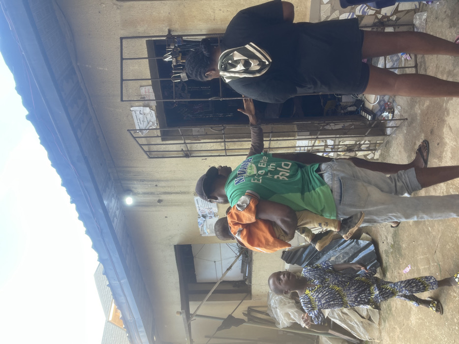 - "The scene depicts an outdoor gathering of four individuals near a weathered building in Uturu, Nigeria, under bright daylight" by FM-aUL5t2, licensed under CC BY 4.0
