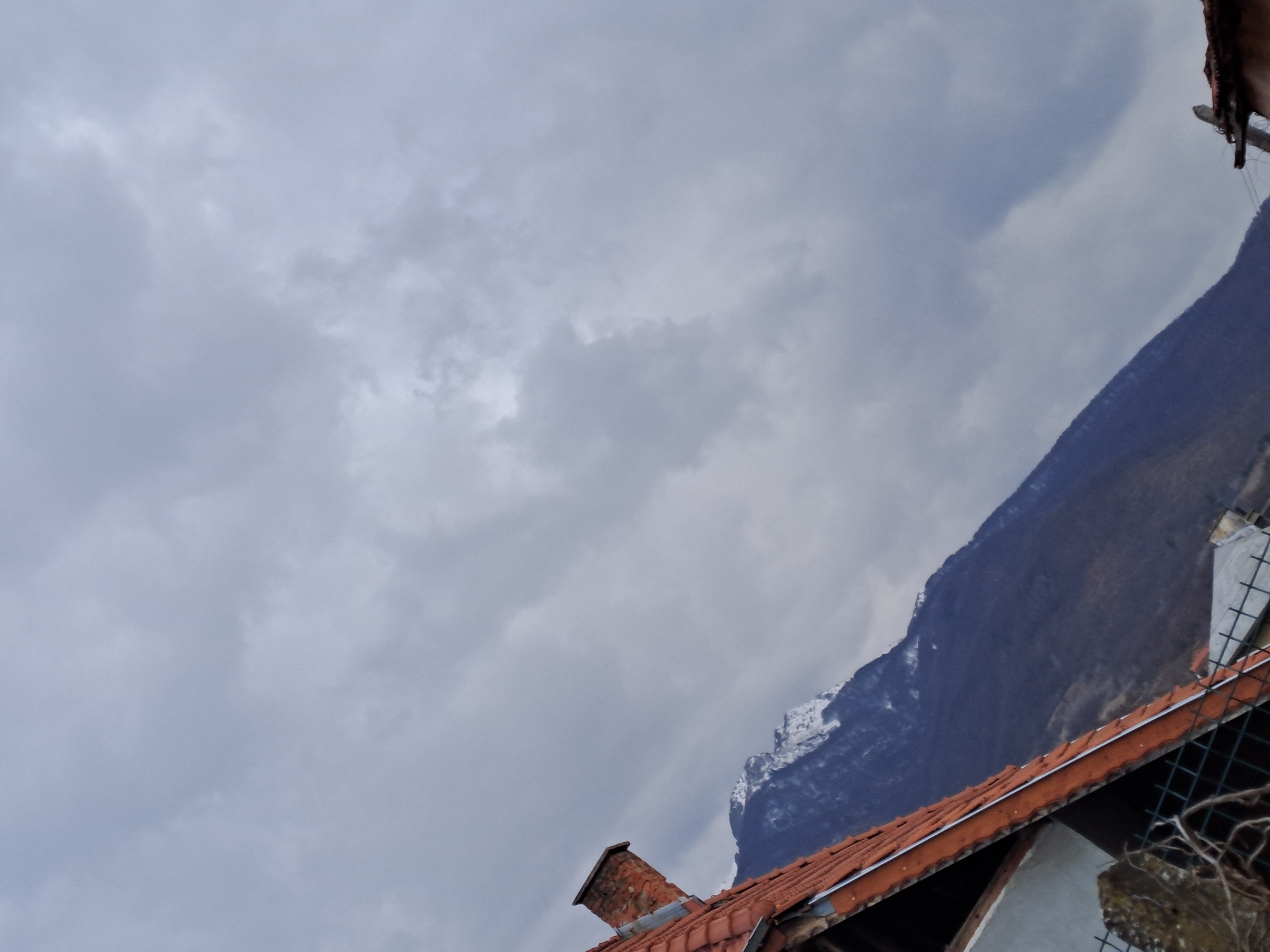 The image depicts a mountain landscape in Varshets, Bulgaria, observed from a residential vantage point under an overcast sky. The sky, occupying the upper two-thirds of the frame, is entirely covered by dense, gray clouds, with minor variations in light intensity. In the mid-ground and background, a large mountain range is prominent. The upper slopes and peaks of these mountains are covered in snow, presenting as white patches against the darker, forested lower slopes. The lower slopes are densely covered with dark vegetation. In the foreground, positioned in the lower left, a section of a terracotta-tiled roof is visible, angled diagonally across the frame. A brick chimney rises from this roof. Below this roof, a segment of a green wire mesh fence is discernible, along with some bare, dark plant branches. A small portion of another terracotta-tiled roof is visible in the extreme lower right corner. No people or animals are present.