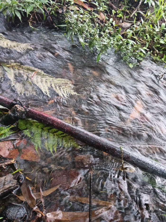 A stream flows over fallen leaves and debris, its surface blurred by motion