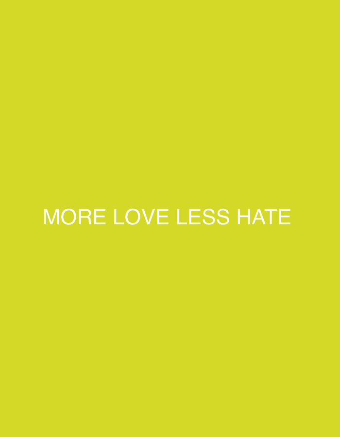 A bright yellow background fills the image. White text is centered near the middle, reading "MORE LOVE LESS HATE" in all caps. The font appears to be a clean, sans-serif style. The words are evenly spaced, and the overall impression is simple and direct.