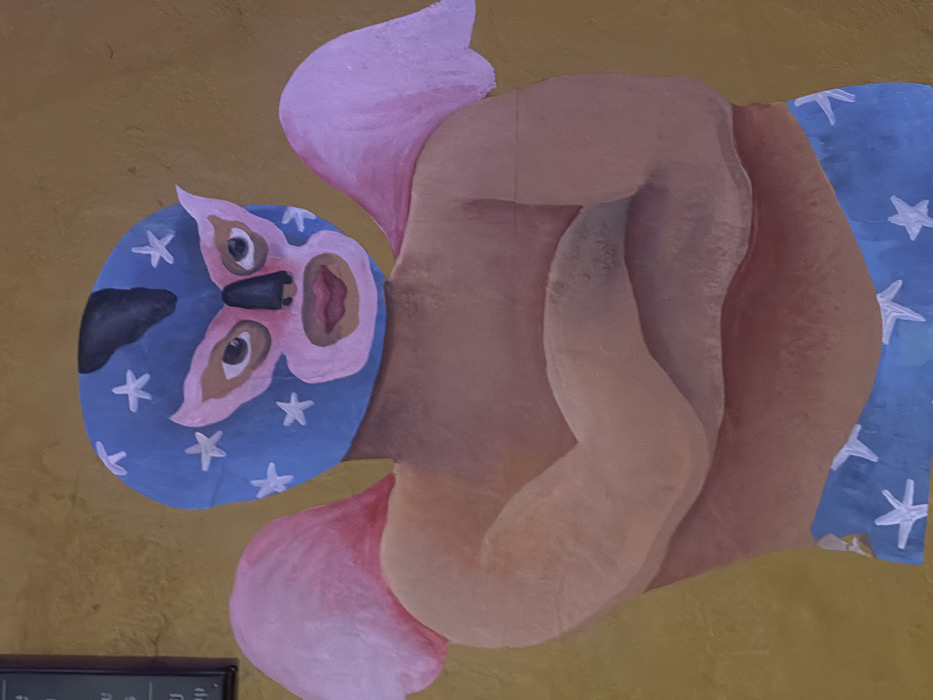 The image depicts a colorful, whimsical painting of a luchador (Mexican wrestler)