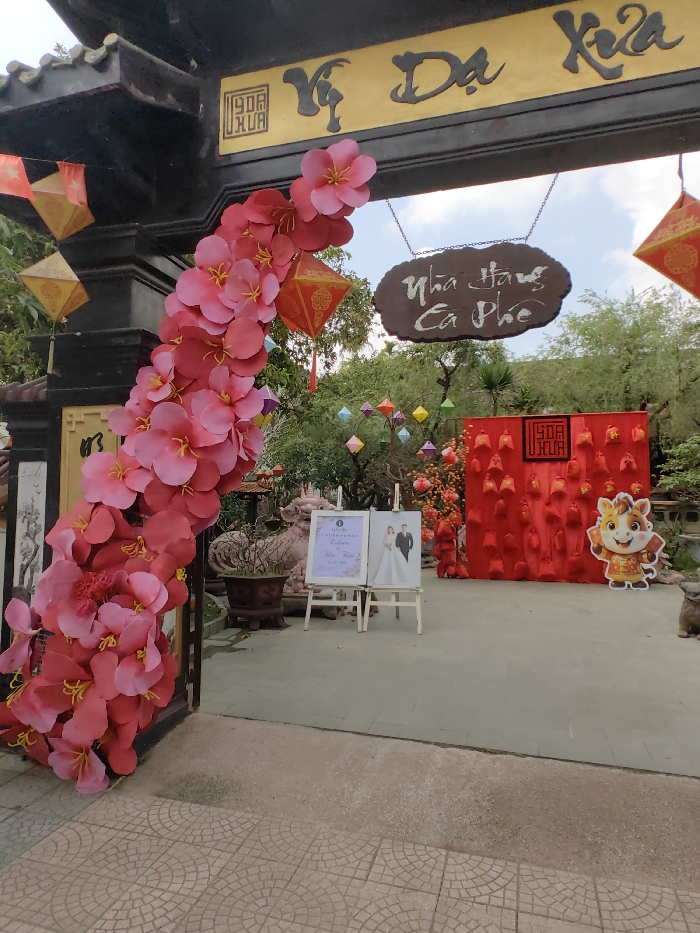 The image depicts an outdoor entrance area to a establishment named "Vỹ Dạ Xưa Nhà Hàng Cà Phê" (Old Vỹ Dạ Restaurant Cafe) in Vỹ Dạ Ward, Vietnam, adorned with festive decorations