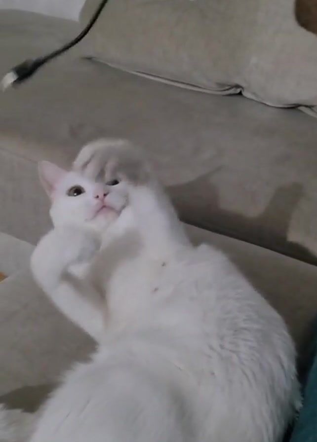 A white cat lies on its back on a light brown sofa, its front paws in the air. A hand holding a black cable moves the cable near the cat, causing it to extend its paws as if trying to catch it. The cat’s eyes are open and focused on the cable. The couch has a large pillow resting against the back. The person’s forearm is visible in the frame.
