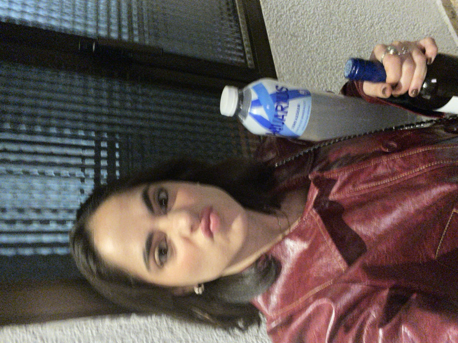 A brunette woman in a red jacket holds a water bottle and a bottle of wine. The water bottle has a blue label and the wine bottle has a blue cap. The woman is looking at the camera with her lips pursed. She is wearing earrings and rings. The background includes a wall and a window with horizontal blinds. The image is slightly blurry and the angle is unconventional.