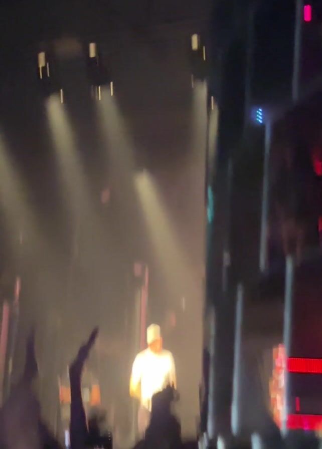 The scene depicts a musical concert in a large, dimly lit indoor venue