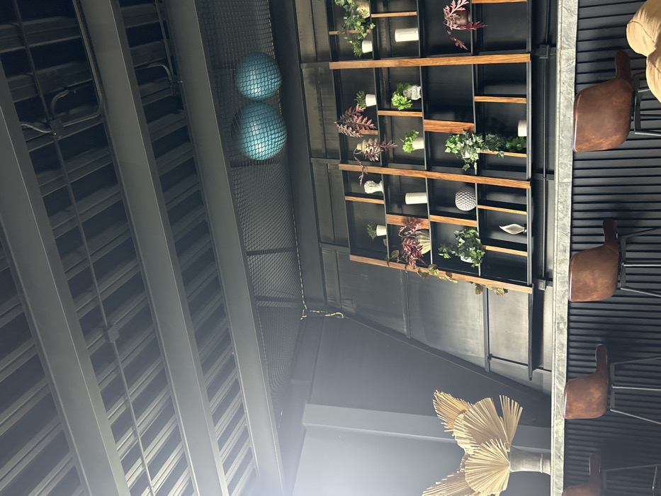 The image displays an indoor commercial establishment, likely a bar or lounge, situated in San Bernardino Tlaxcalancingo, Mexico. The scene features a dark, industrial-style aesthetic. The ceiling consists of exposed dark-painted metal corrugated decking and structural I-beams, with visible electrical conduit. A bright light source is present on the upper left. High on the right wall, two light blue inflatable exercise balls are contained within a dark metal mesh storage area. A yellow electrical cable or rope hangs vertically from the upper wall structure on the left. The background wall is dark, incorporating a sloped panel on the left. Dominating the central wall is a dark, multi-tiered shelving unit with vertical wooden or wood-effect dividers, displaying various potted plants (including green foliage and reddish-leafed varieties) alongside white or light-colored decorative objects such as a classical bust, cylindrical vases, and textured spheres. Below the shelving, a bar or counter surface of a grey, textured material is visible, supported by a dark, vertically slatted front panel. In the foreground, several brown, faux-leather bar stools with dark metal bases are positioned along the counter. On the far left of the counter, a large decorative arrangement composed of numerous light-colored, fan-shaped elements emanating from a dark vase is present. No individuals are depicted in the scene.