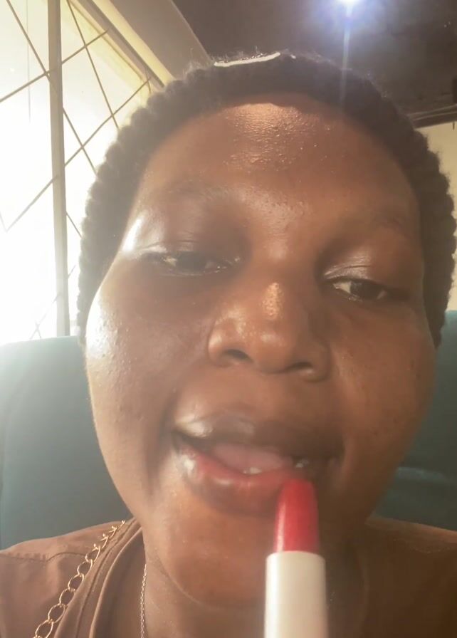 A person with dark skin, wearing a brown shirt and a dark knit cap, is applying red lipstick