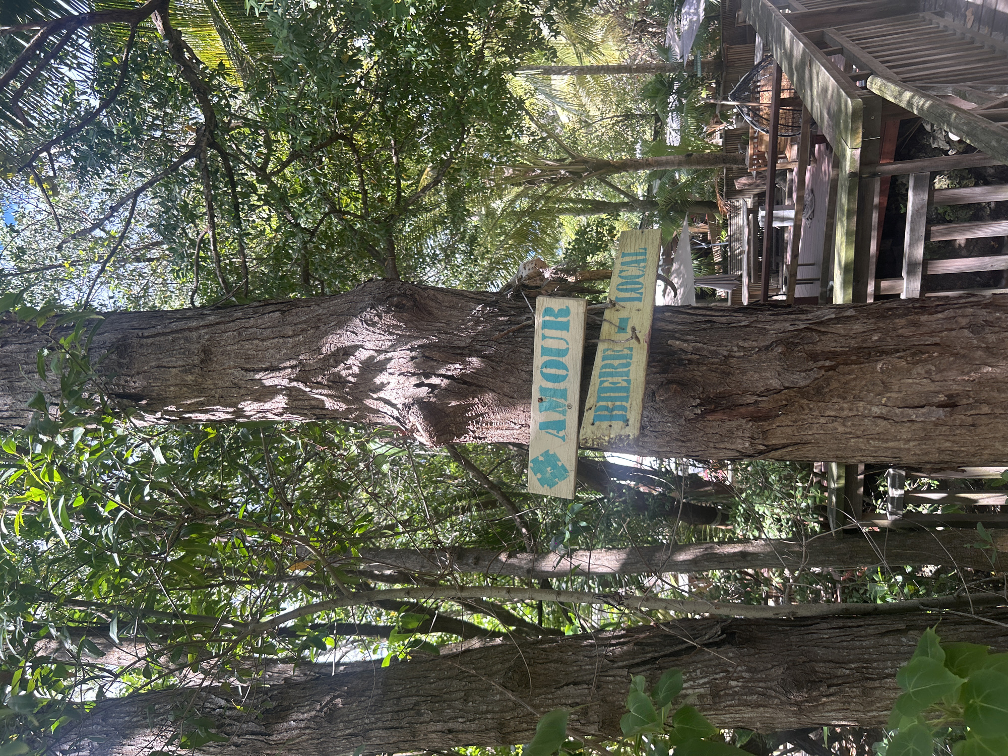 A large tree in Sainte-Anne, France, is seen in the photograph. Affixed to the tree is a weathered, wooden sign that reads "AMOUR BIERE LOCAL" in a light blue, rustic font. The tree trunk is large and textured. The surrounding environment includes dense foliage and glimpses of wooden structures suggesting a deck or building within a natural setting. The scene is sunlit.