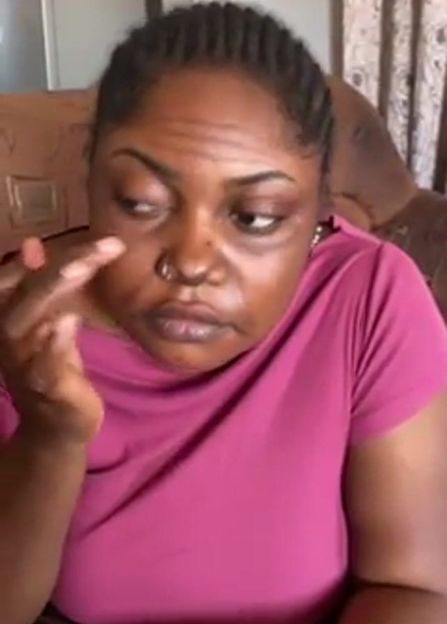 A person with brown skin and braided hair sits indoors in front of a brown sofa and applies a lotion to their forehead and under their eye. The person wears a pink shirt and nose ring. To the left of the person is a white refrigerator. Behind the sofa, a partially visible curtain hangs from a window.