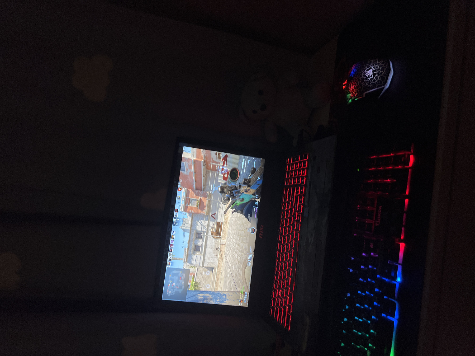 laptop computer displaying a first-person shooter game (likely Counter-Strike), keyboard, and gaming mouse on a dark surface. The keyboard features RGB lighting. The lighting and angle make it difficult to ascertain the exact environment surrounding the scene. There is a stuffed animal partially visible. I am unable to pinpoint the location in the city of Shushary, Russia.