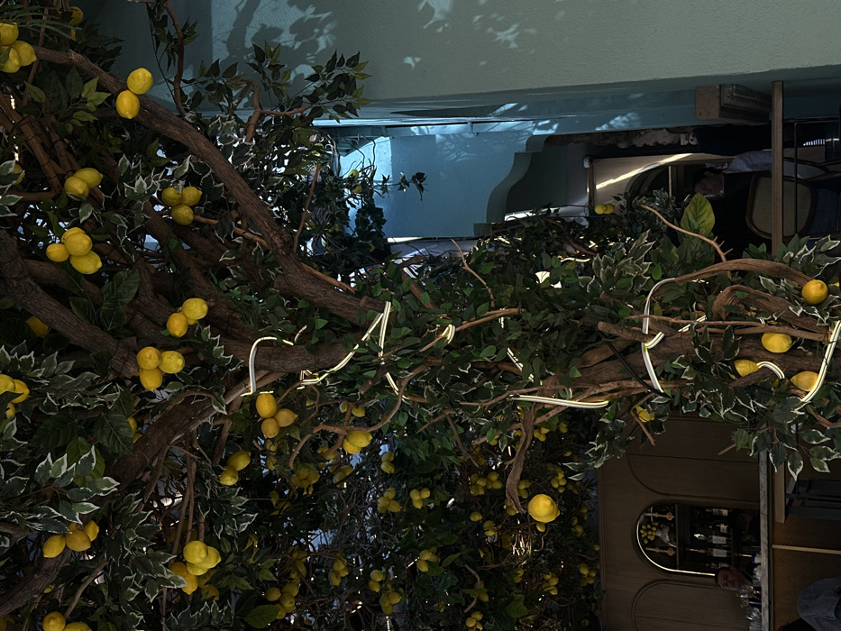 The image displays an indoor scene within a commercial establishment in Mexico City, Mexico. A large, artificial lemon tree dominates the foreground and midground, featuring a brown trunk, numerous green leaves, and an abundance of bright yellow lemons. White LED strip lights are wrapped around the tree's branches and trunk. To the left, a dimly lit bar area is visible behind the tree, characterized by a dark counter, an arched wooden alcove containing bottles on shelves, and a partially obscured individual seated at the counter. To the right, a wall painted in a light teal color exhibits architectural curves and shadows of foliage, with another partially visible individual seated at a table against this wall, facing away from the camera. The overall lighting is subdued, with internal illumination emanating from the tree's lights.