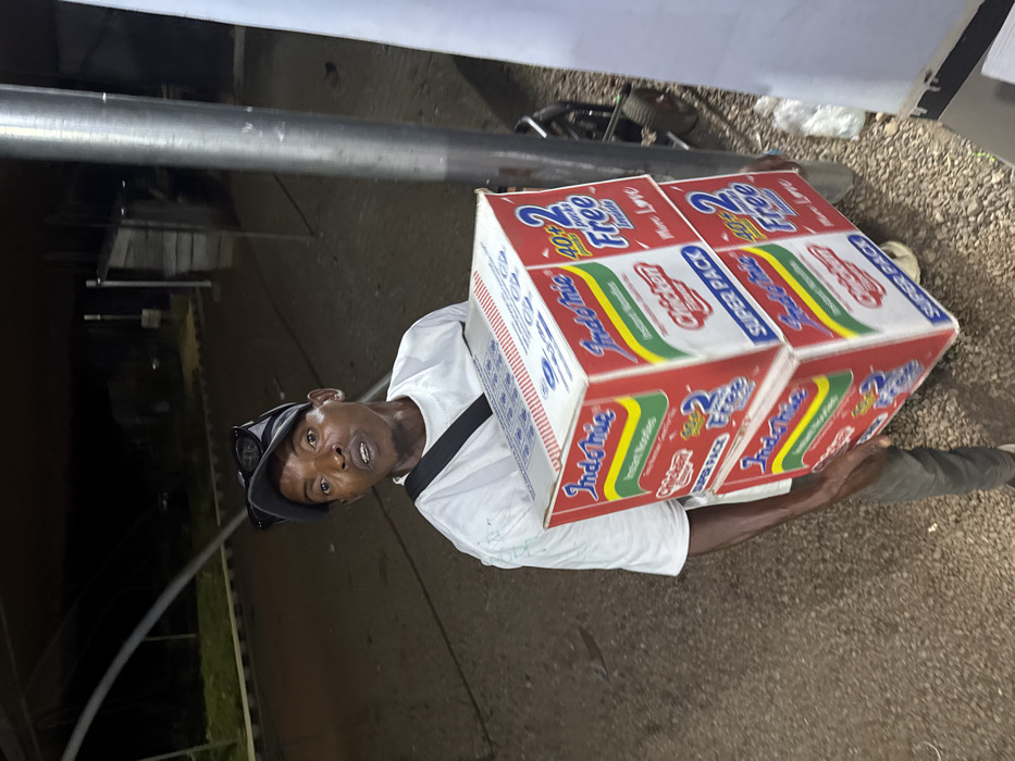 In Adankolo, Nigeria, an adult male is depicted standing at night, carrying four stacked cartons of "Indomie Instant Noodles - Chicken Flavour Super Pack"