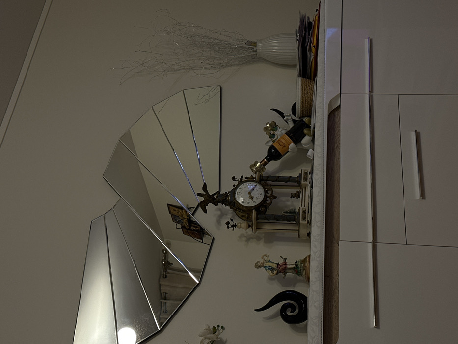The image displays an interior residential scene in Colombes, France. A light-colored wall forms the background, against which a white, modern-style cabinet with multiple drawers and rectangular silver handles is positioned. Above the cabinet, a large, multi-segmented mirror with a fan-like geometric design is mounted, reflecting interior elements such as curtains and framed artwork. The top surface of the cabinet serves as a display area for various decorative objects. From left to right, these include: a partially visible white floral arrangement; a black, abstract spiral-shaped sculpture; a colorful ceramic figurine depicting a young boy in historical clothing holding an object, standing on a pedestal; and an ornate antique mantel clock, featuring columns, a visible clock face, and a golden eagle figure atop its structure. To the right of the clock, a white figurine is shown holding a dark-colored wine bottle, identifiable as Veuve Clicquot Champagne by its orange label. Adjacent to this, a small woven basket and a stack of papers or magazines are present. The far right side features a tall, white fluted vase containing numerous white decorative branches. The scene is lit from the left, creating shadows and highlights on the objects. No people are depicted.