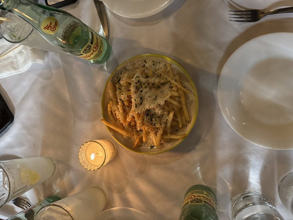 The image depicts a dining table in a restaurant located in Guadalajara, Mexico, under dim lighting, indicative of an evening setting. The table is covered with a white tablecloth. A central, yellow-rimmed white bowl contains a serving of golden-brown french fries, generously topped with finely grated white cheese and sprinkled with chopped green herbs. Adjacent to the bowl, a lit candle in a clear glass votive holder provides illumination. Several beverages are present: a partially full green glass Topo Chico mineral water bottle stands upright on the upper right, next to a clear drinking glass containing a clear liquid, ice, and a straw. Two additional clear glasses, each containing a liquid and a lime wedge, are positioned in the upper left. Another partially visible clear glass is in the lower left. An empty white ceramic plate and a silver fork are placed in the lower right, indicating a place setting. A silver knife is visible next to the Topo Chico bottle. A dark rectangular object, consistent with a mobile phone, rests on the tablecloth in the upper center. No individuals are visible.