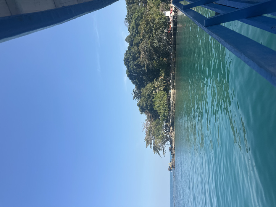 From a boat's perspective, a sunny day reveals a calm, turquoise sea meeting a lush, tree-lined shore. Dense green trees cover the land, some leaning towards the water. The boat's blue railing and structure frame the view. The sky is clear blue.