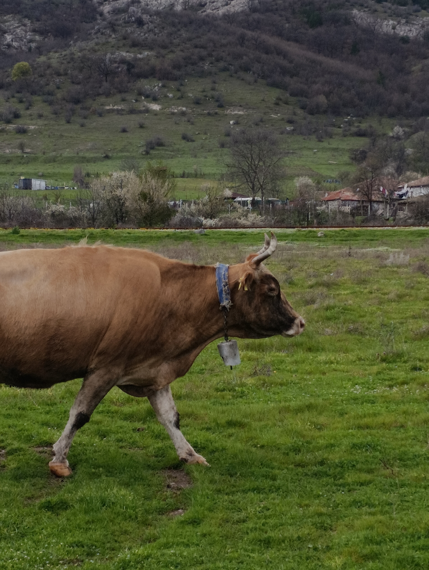 A brown cow with horns and a blue collar with a bell is walking through a grassy field. In the background, there is a landscape of rolling hills covered with trees and shrubs. Further back, there are buildings and what appears to be a small settlement. The location is the city of Shiroko pole, Bulgaria.