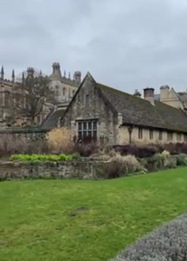 view of a stone building and green lawn under a cloudy sky. The building in the foreground is long and low with a steeply pitched roof. Behind it is a taller stone structure with a tower. A manicured lawn stretches out in front, bordered by a low hedge. The scene is still and peaceful, suggesting a location in a historical or academic setting.