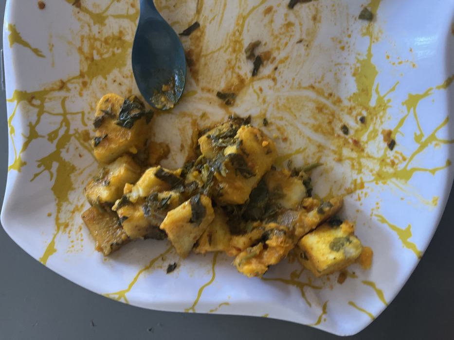 A partially consumed meal is depicted on a white, irregularly shaped plate with yellow splatter patterns, situated in Lokoja, Nigeria. The plate contains remnants of a dish featuring cubed, light-colored starchy items, possibly yam or potato, mixed with dark green leafy vegetables and coated in an orange-red sauce. A dark blue plastic spoon rests within the sauce remnants on the right side of the plate. The background consists of a dark grey, undifferentiated surface. No individuals are visible.