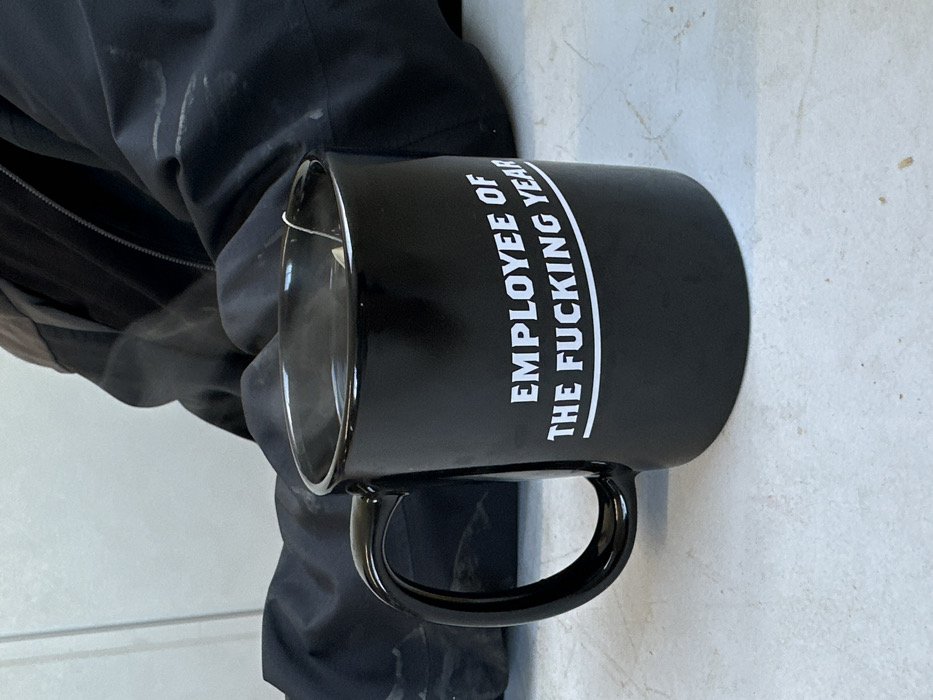 In Hertsmere, United Kingdom, a black ceramic mug rests on a light grey, textured surface. The mug features white, sans-serif text reading "EMPLOYEE OF THE FUCKING YEAR," with the second line underlined. Steam rises from the hot liquid inside the mug, from which a white tea bag string is visible. Partially obscured and out of focus in the background, a person wearing a dark jacket with lighter grey shoulder sections is present, positioned against a plain, light-colored wall.