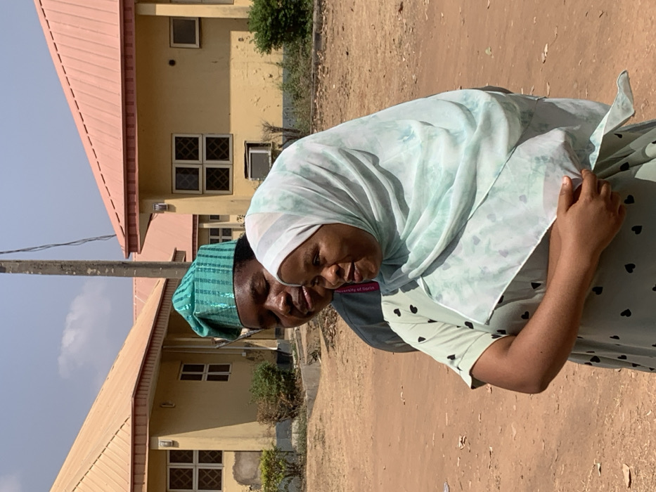 The scene is situated outdoors in Apata Yakuba, Nigeria, featuring two individuals, a female in the foreground and a male behind her, positioned against a backdrop of single-story buildings