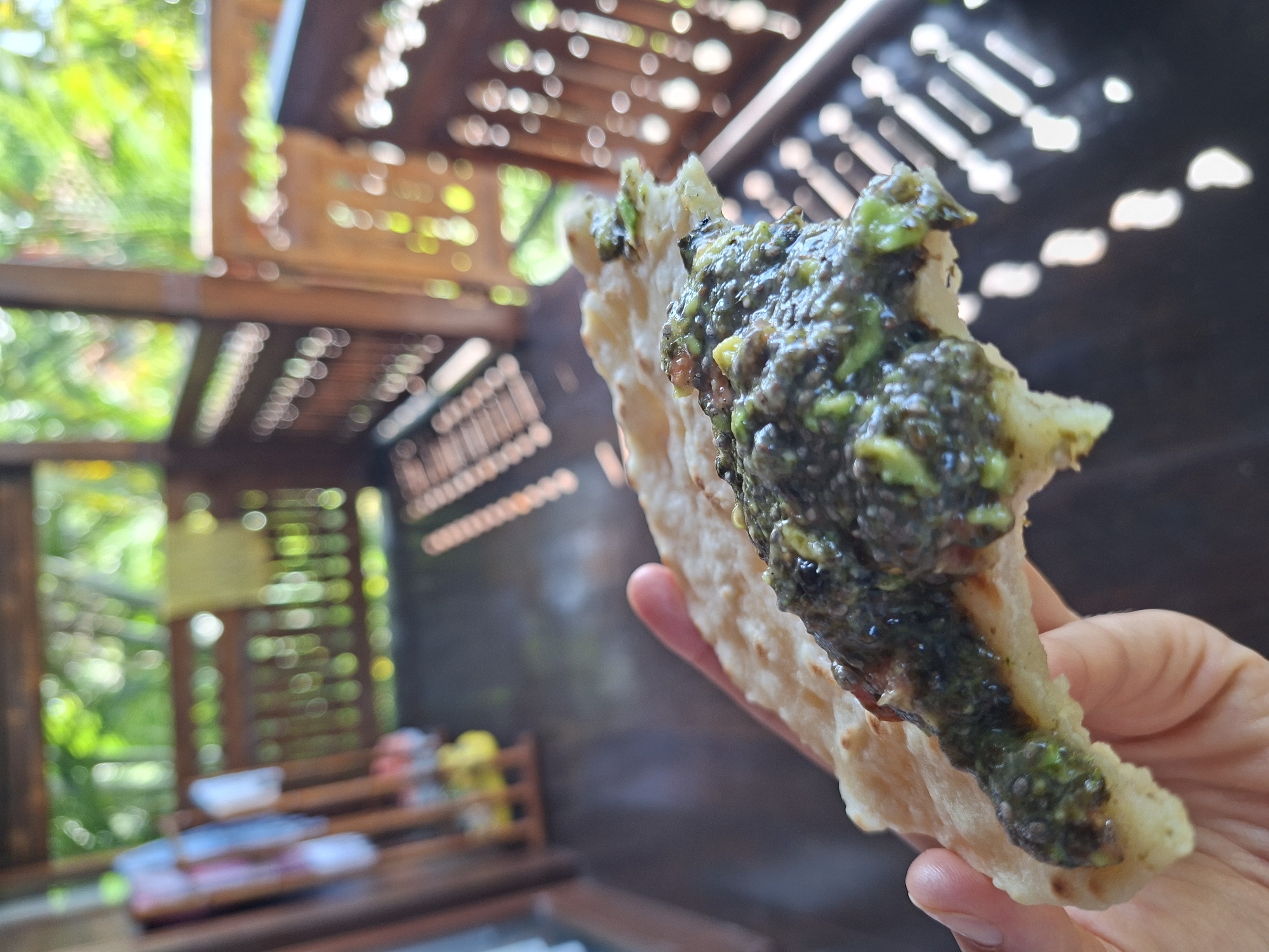 A person's hand holds a piece of flatbread topped with a dark green, textured spread. The location is Lodtunduh, Indonesia, suggested by the wooden structure with sunlight filtering through it in the background, a common architectural element in the region. The structure is open-air, possibly a gazebo or veranda. In the out-of-focus background, there's greenery visible. The wooden structure and surrounding foliage point to a natural or semi-rural setting. The focal point is the food, which suggests the activity is either eating or food preparation and presentation.