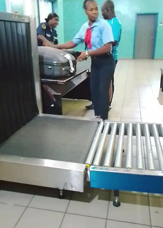 n airport security checkpoint with three individuals present