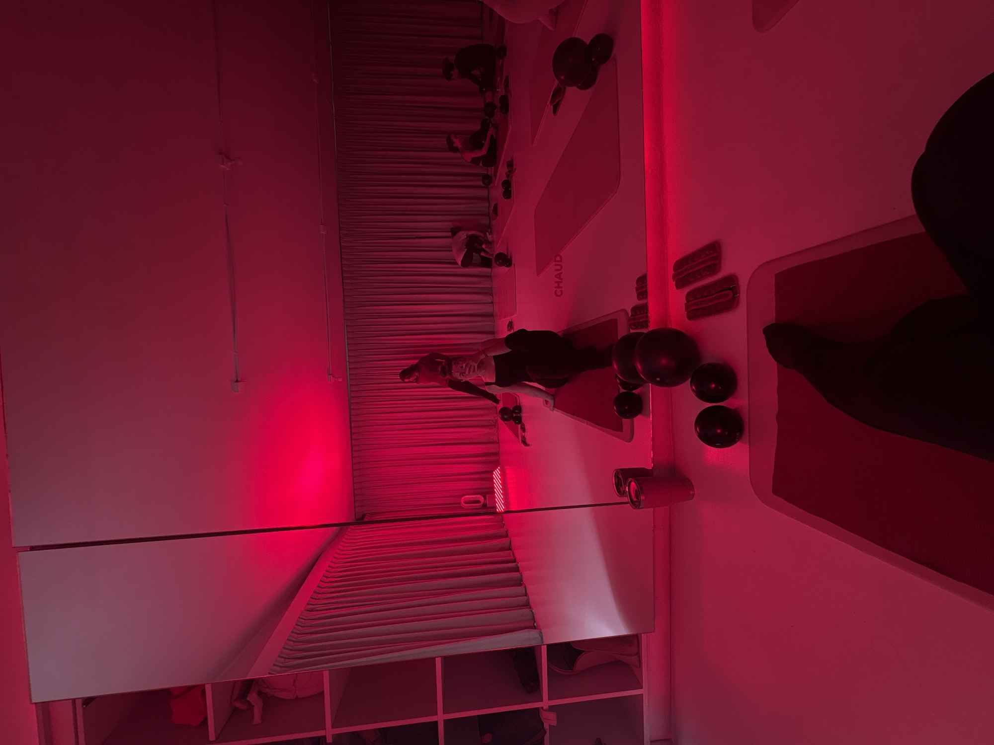 The image depicts the interior of a workout studio in Mexico City, Mexico. The studio has a red-toned lighting scheme. Several people are exercising on individual workout mats. Black exercise balls and other small workout equipment are visible near each mat. A large mirror covers a wall, reflecting the studio's interior, including the ceiling and a storage unit underneath the mirror. The word "CHAUD" is printed on the wall.