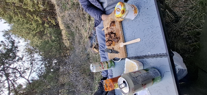 The image captures an outdoor picnic setting within a forest environment characterized by numerous pine trees and dry, sparse ground vegetation. A portable, grey folding table is positioned in the foreground, displaying a wooden cutting board with several pieces of cooked, dark-brown meat, an open black folding knife, and a light-colored wooden disposable fork. Other items on the table include an open aluminum beverage can with a partially visible label, a "Zlatý Bažant" branded aluminum can, a glass jar containing a red sauce, a white rectangular container with a light-colored substance, and a small glass jar with a yellow lid. A white plastic bag is visible beneath the table. The lower torso and legs of an individual, clad in dark pants and a dark blue or grey jacket, are visible, seated behind the table. In the background, a small, contained campfire with visible embers is present on the ground. The sky is partially visible through the tree canopy, indicating daylight. No specific city location is discernible beyond the natural woodland setting.