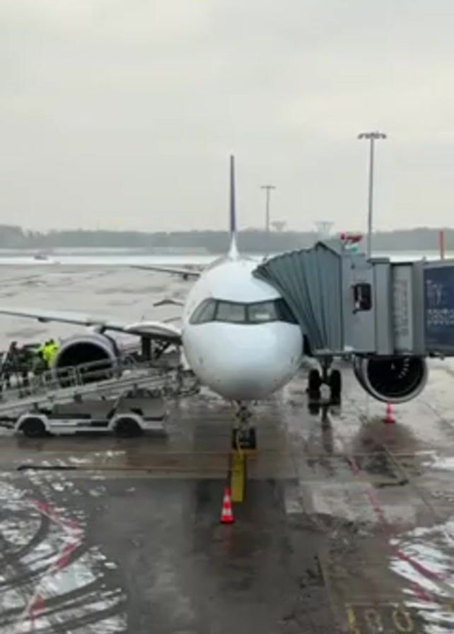 An airplane stands at an airport gate. The day appears to be overcast and the ground is wet with traces of snow. A jet bridge is connected to the aircraft, and a baggage conveyor belt is positioned near the plane's engine. A person wearing a high-visibility jacket is visible near the baggage conveyor. The airport tarmac shows streaks of water and residual snow. The jet bridge has an advertisement on its side. The overall scene depicts ground operations occurring around a parked airplane at an airport under wintry conditions.