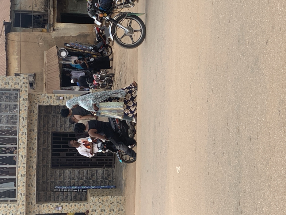 This image depicts a daytime street scene in Egbedi, Nigeria, featuring a cluster of individuals, motorcycles, and buildings. In the foreground, a wide, light-colored asphalt road occupies the lower third of the frame, with a small piece of white debris visible near the center. In the mid-ground, a group of people and motorcycles are positioned near the edge of the road and the entrance to two adjacent buildings. From left to right: * A multi-story building with a textured stone facade (beige, brown, and grey tones) stands prominently on the left. Its ground floor features a dark double door or gate and two wall-mounted light fixtures. The upper floor has multiple windows. * A man in a white collared shirt with a partial graphic design on the chest stands facing right, engaging with others. * Seated on a dark scooter, a man in a black sleeveless top and dark pants faces right, his left foot on the ground. * Behind the man on the scooter, a small group of men are gathered, their actions indistinct. One wears a light-colored sleeveless garment. * A woman walks from right to left in the immediate foreground of this group. She wears a patterned head covering (hijab) of light blue and white, and a long dark dress with a prominent white and yellow floral pattern. She carries a striped fabric bag in her left hand. * Adjacent to the stone building on the right is a two-story building with a weathered, light brown facade and a rusted corrugated metal roof. The ground floor features an open storefront with various long items (possibly sticks or tools) and fabrics hanging for sale. Several individuals are visible inside and around this storefront. * Multiple motorcycles are present: one scooter is beneath the seated man, several are parked near the right building (one with a visible red tank), and the front wheel and chrome fender of another motorcycle are partially visible in the far right foreground. The overall environment suggests a commercial or mixed-use urban area.