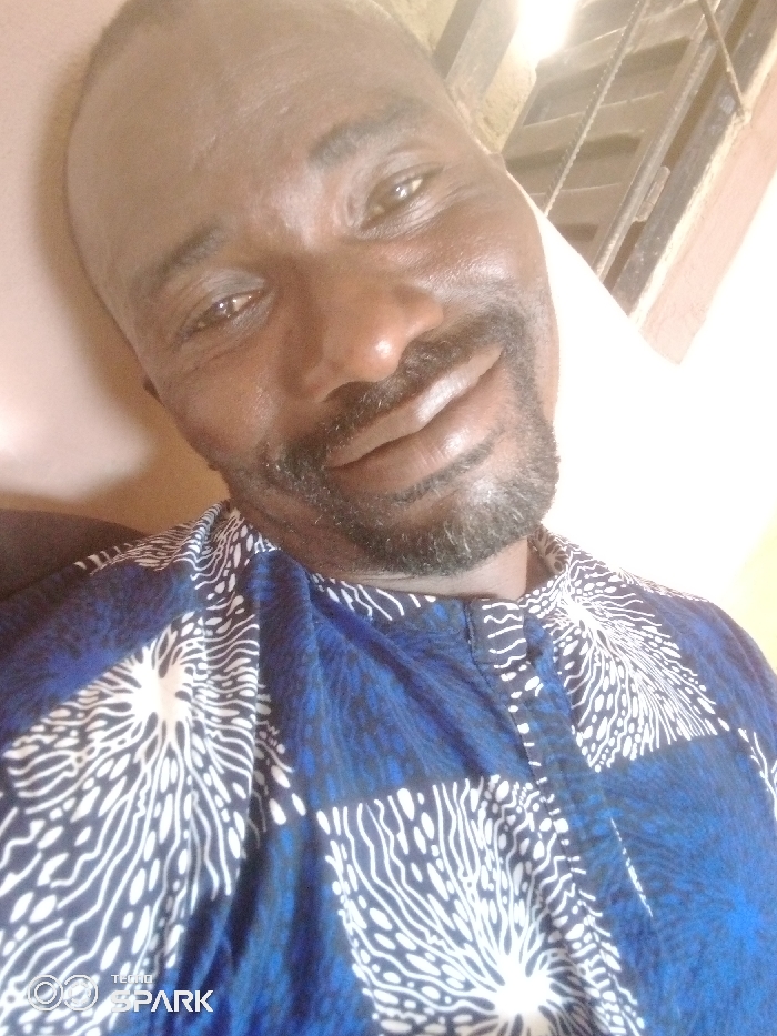 A close-up, front-facing photograph depicts an adult male with dark skin, a shaved head, and a dark beard with some grey coloration. He is smiling broadly, revealing his teeth, and looking directly at the camera. He wears a blue garment patterned with white, abstract, radiating designs. The background is out of focus; a light-colored wall is visible to the left, and a brightly lit area with a dark, possibly metallic, grated structure is visible to the upper right. The scene is located indoors in the city of Ajaokuta, Nigeria.