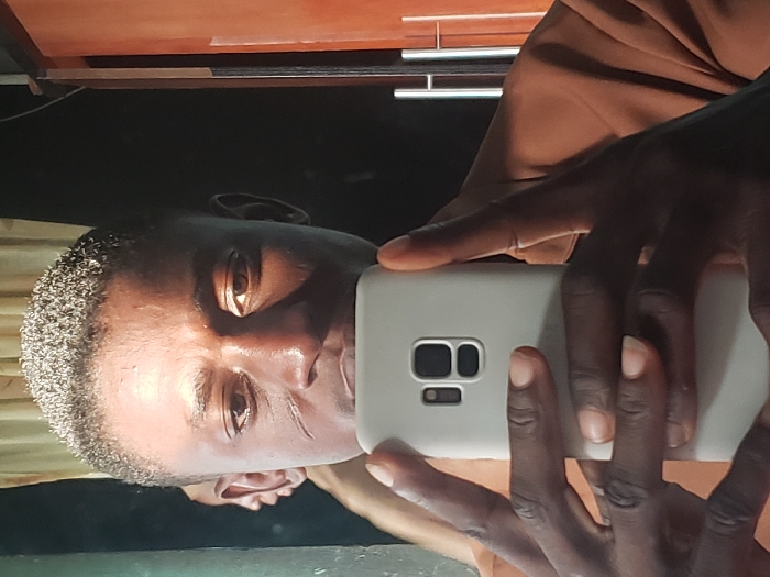 A dark-skinned person with short, light-colored hair is holding a smartphone, presumably taking a selfie. Their face is angled slightly, revealing a focused gaze. The phone's dual camera setup is visible. A glimpse of brown clothing or fabric is seen in the background, along with a blurred interior suggesting a cabinet or a similar structure. The lighting is somewhat dim, casting shadows across the face.