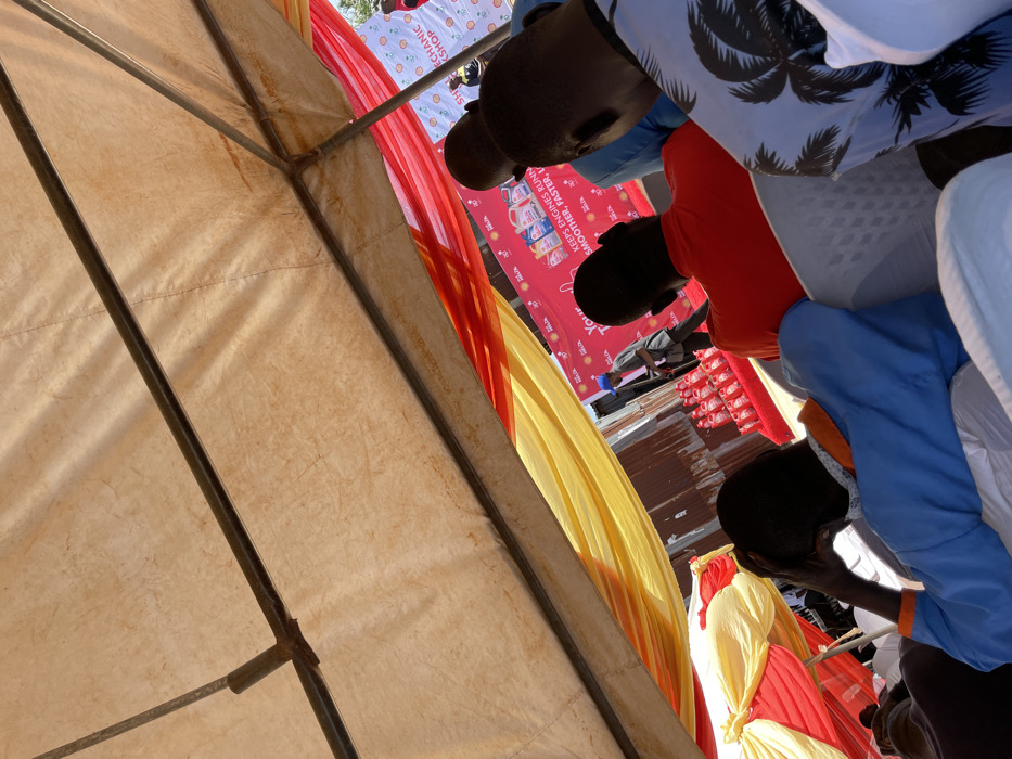 The image depicts an outdoor product promotion or workshop event in Jos, Nigeria, viewed from beneath a light-colored, possibly beige, canvas tent canopy supported by dark metal poles