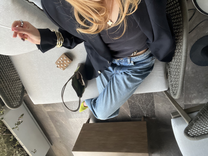 The image displays an overhead perspective of an individual reclining on an outdoor lounge chair, which features light grey upholstery and a dark grey woven frame. The person's torso and legs are visible, dressed in light blue denim jeans, a dark top, and a dark blazer. A metallic chain is present around the waistline, above the jeans. The visible right foot wears a neon yellow pointed-toe shoe. The person's left hand, adorned with multiple gold-colored bangles on the wrist and a silver-colored ring on a finger, rests near the body, holding a thin white object. A small, golden, cross-shaped ornament is visible in the foreground, within light-colored hair. Adjacent to the individual's leg, on the lounge chair, are a small, dark green handbag with a visible light-colored interior item and a tan-colored, rectangular case with multiple silver studs. A black wide-brimmed hat is partially visible on the dark grey, veined tile flooring to the far left. In the background, a light brown wooden bench or table is present. Beyond this, a white planter box containing green foliage is visible, indicating an outdoor or semi-outdoor patio environment. The location is an outdoor patio.