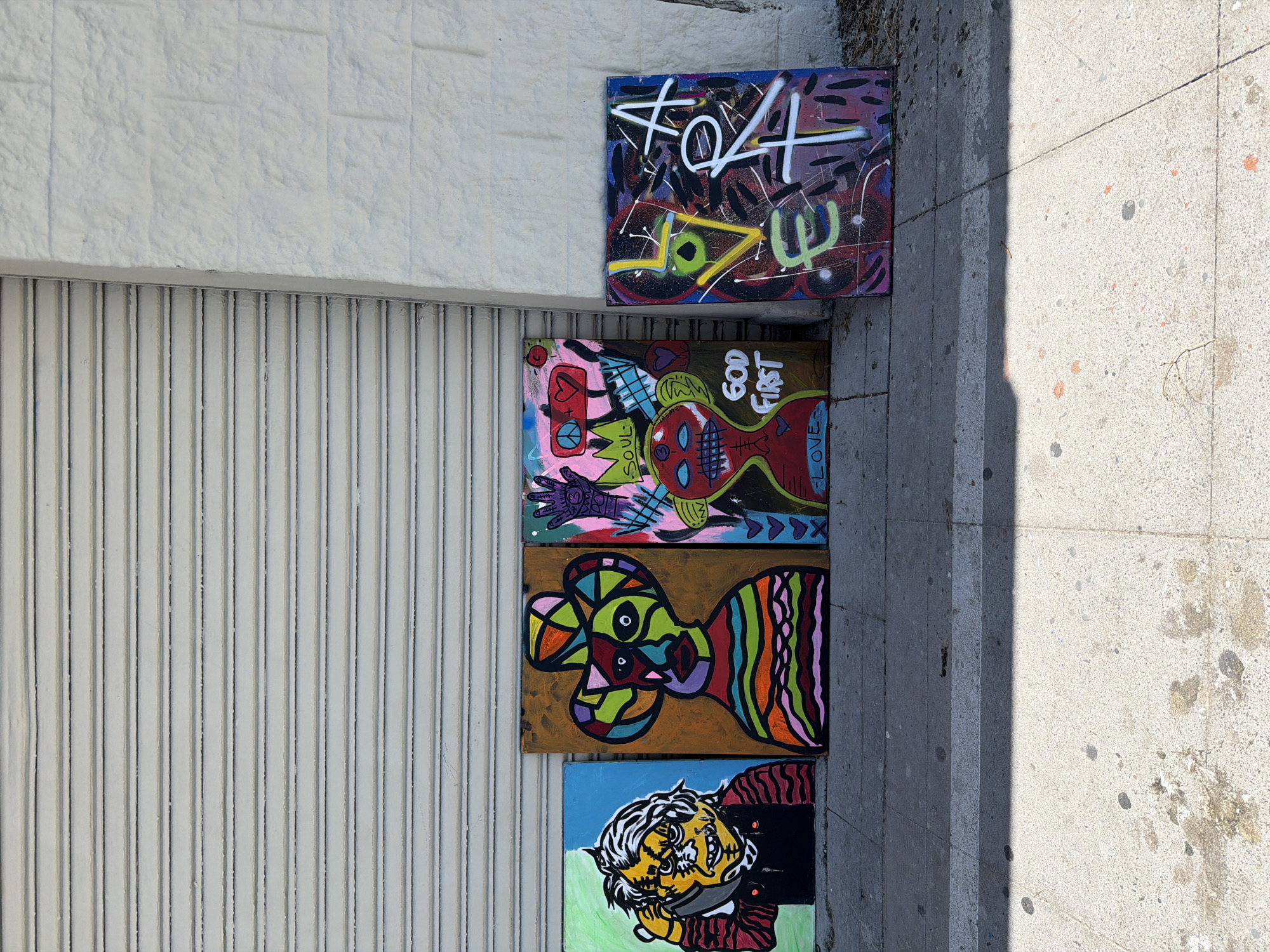 four paintings leaning against a wall and the sidewalk next to it. The wall has a section of vertically ribbed metal on the left, and a textured white section on top. The paintings are stacked vertically, one on top of the other. The top painting has a dark background with a white graffiti-style symbol, along with yellow and green markings. The second painting has a pink and blue background with an image of a red figure with "GOD FIRST" written next to it. The third painting has a brown background with a colorful cartoon-like figure with striped and geometric patterns. The bottom painting has a green and blue background with a cartoonish face. The sidewalk on the right is gray and speckled with stains and debris. The location is not identifiable as Los Angeles, United States of America.