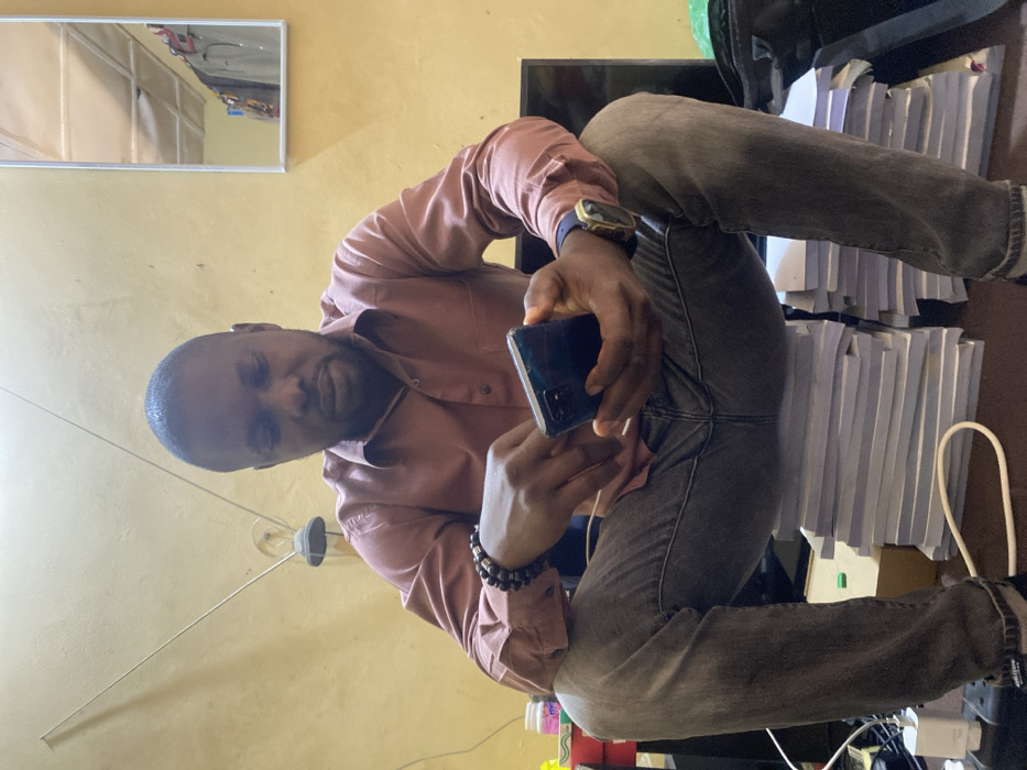 An adult male, of dark complexion, with short hair and a beard, is depicted seated in a room in Jos, Nigeria