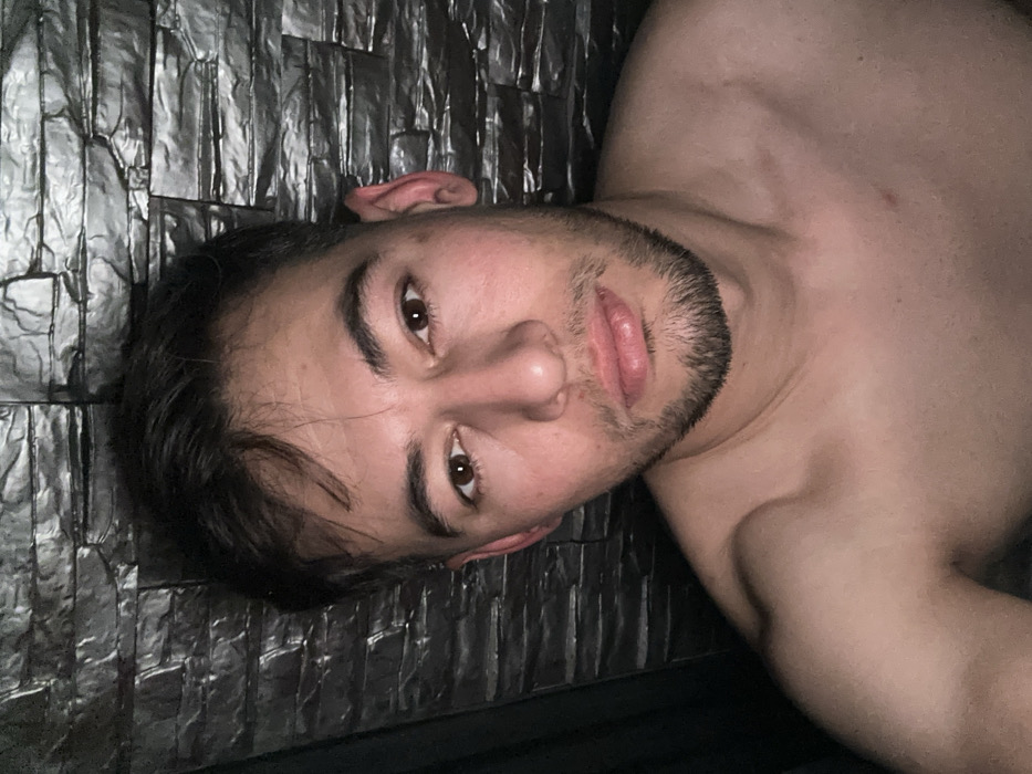 A close-up, slightly rotated portrait features a shirtless man with dark hair and a trimmed beard. He has light skin, brown eyes, and is lying down against a textured metallic or foil-like surface. His gaze is directed towards the camera. The lighting is dim, creating shadows on his face and body, with a darker background below his shoulder.