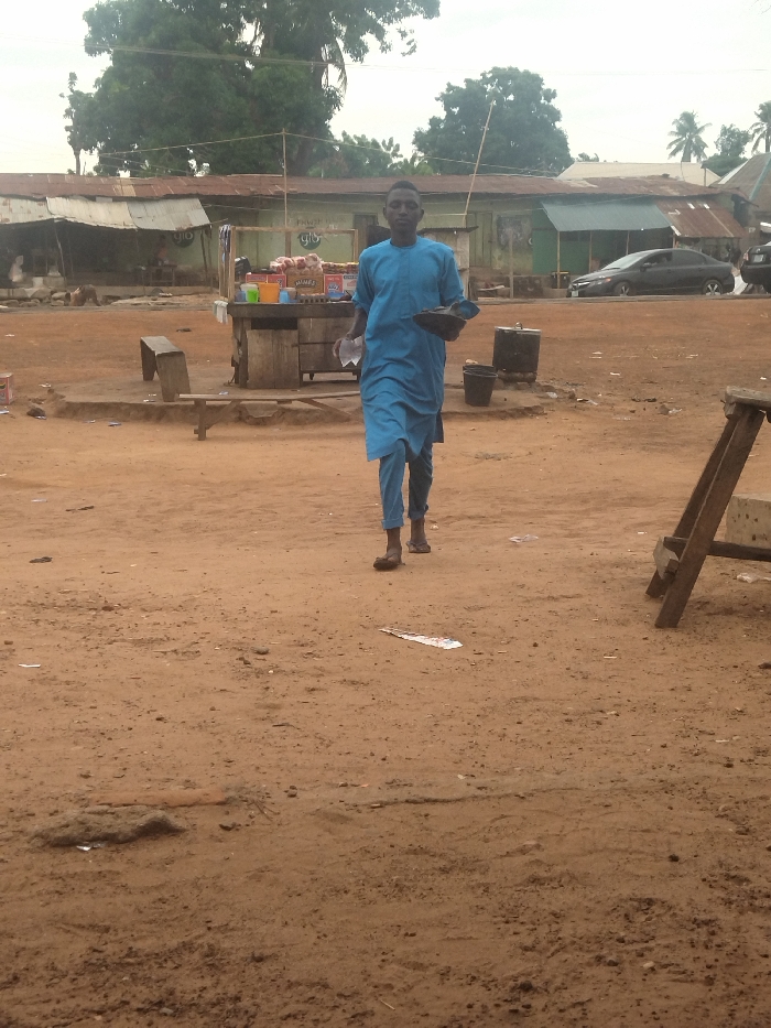 A young man in a blue tunic walks away from the camera toward the left side of the frame. He is walking on a dirt road in a small town. There is a small stand to the right of him with various items on it, including some colorful packages and a bucket. The road is bordered by buildings and a small green area on the right. There are a few cars parked in the background. The man is carrying a white dish in his right hand. He is walking alone. The weather appears overcast and the sky is a light gray. The location is in Asuir, Nigeria, at coordinates (latitude: 7.685, longitude: 8.536).