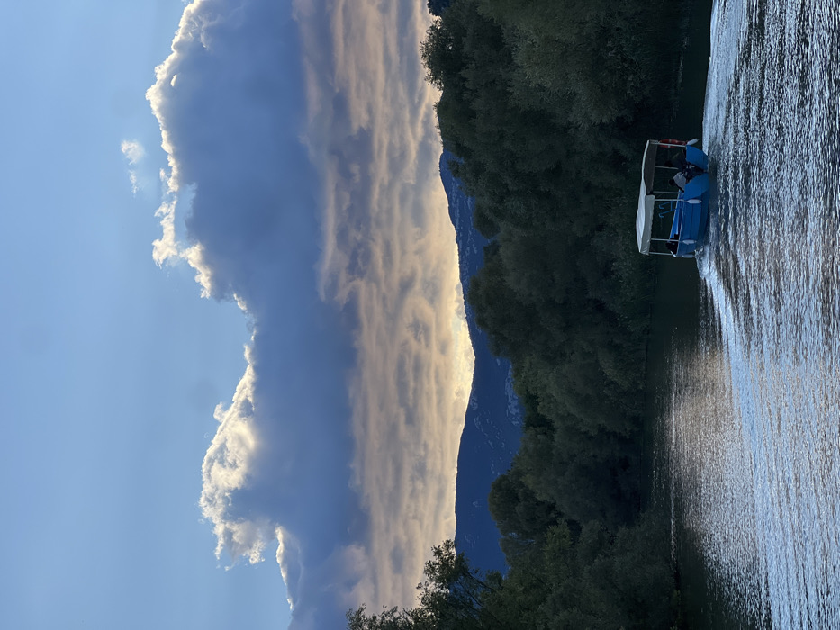 The image depicts a tour boat navigating a waterway in Virpazar, Montenegro, likely a channel connecting to Lake Skadar, at either sunrise or sunset. In the foreground, a dark body of water shows a prominent V-shaped wake trailing behind a light blue, open-top recreational boat. The boat, positioned towards the lower right, features a white canopy roof and two white cylindrical fenders visible on its port side. At least two individuals are discernible within the boat's seating area, facing forward. Dense, dark green trees and lush vegetation line both sides of the waterway, extending into the midground. Behind the vegetation, distant dark blue-grey mountains with some lighter patches on their slopes stretch across the horizon. The sky above is partially clear blue at the top, transitioning to a large expanse of cumuliform clouds. These clouds are dark grey and dense in their lower sections, with bright white, sun-illuminated edges where the sun's rays break through or catch the cloud tops. Lower, thinner stratiform clouds exhibit warm, golden-orange hues from the sun, which is obscured or low on the horizon, backlighting the scene and creating a chiaroscuro effect on the landscape.