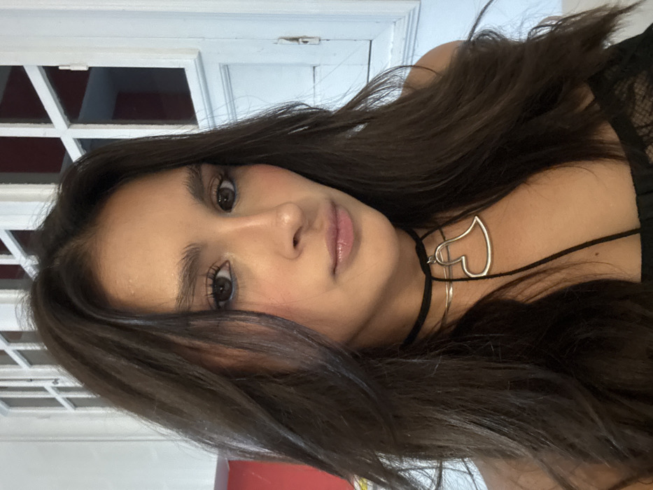 A brunette woman faces the camera with her head tilted slightly. She wears a black choker and a heart-shaped pendant necklace. Her eyes are brown, and she has long eyelashes. The background includes a white paneled door and a hint of red. Her hair is long and wavy, cascading over her shoulders. She appears to be indoors, possibly in a room with natural lighting.