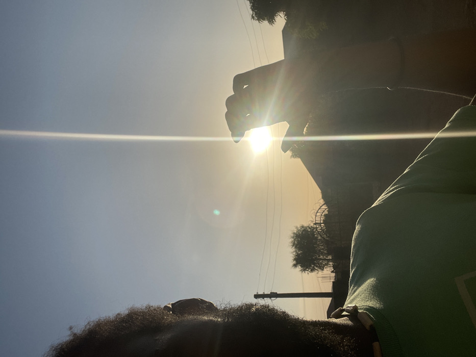 An outdoor scene in Jos, Nigeria, depicts a low sun in the sky, positioned towards the right side of the frame, emitting a strong light and a vertical lens flare. The sky above is a clear light blue, transitioning to a warm yellowish-orange near the horizon. The left side of the image features the dark, curly hair and beard profile of a person's head, along with their left ear. Their left shoulder and upper arm, clad in a green t-shirt, are visible. A necklace adorned with light-colored beads is around their neck. The person's left hand is raised into the frame from the right, partially obscuring the sun. In the background, silhouetted against the bright sky, are a utility pole with multiple overhead lines, distant residential structures with tiled roofs, and various trees and foliage. The lighting conditions are consistent with either sunrise or sunset.