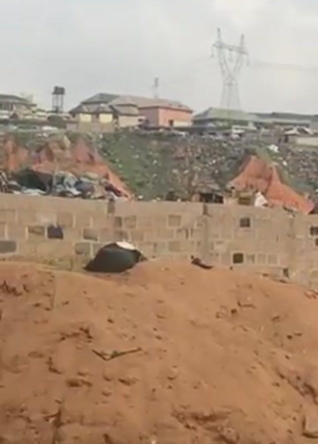 scene of environmental degradation in what appears to be a residential area. Large piles of trash and debris are visible, covering the landscape. There are unfinished concrete block structures and mounds of red dirt in the foreground. In the background, houses and electrical power lines are visible, suggesting a populated area. A few trees can be seen among the debris, including a papaya tree with yellowing leaves. The overall impression is one of neglect and unsanitary conditions.